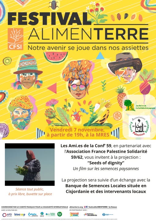 L’AFPS 59/62 (Association France Palestine Solidarité) a le plaisir d’organiser avec l’association les Amis de la Conf’ un ciné-débat autour du film-documentaire "Seeds of Dignity", le jeudi 7 novembre à 19h à la MRES (5 rue Jules de Vicq, 59800 Lille).